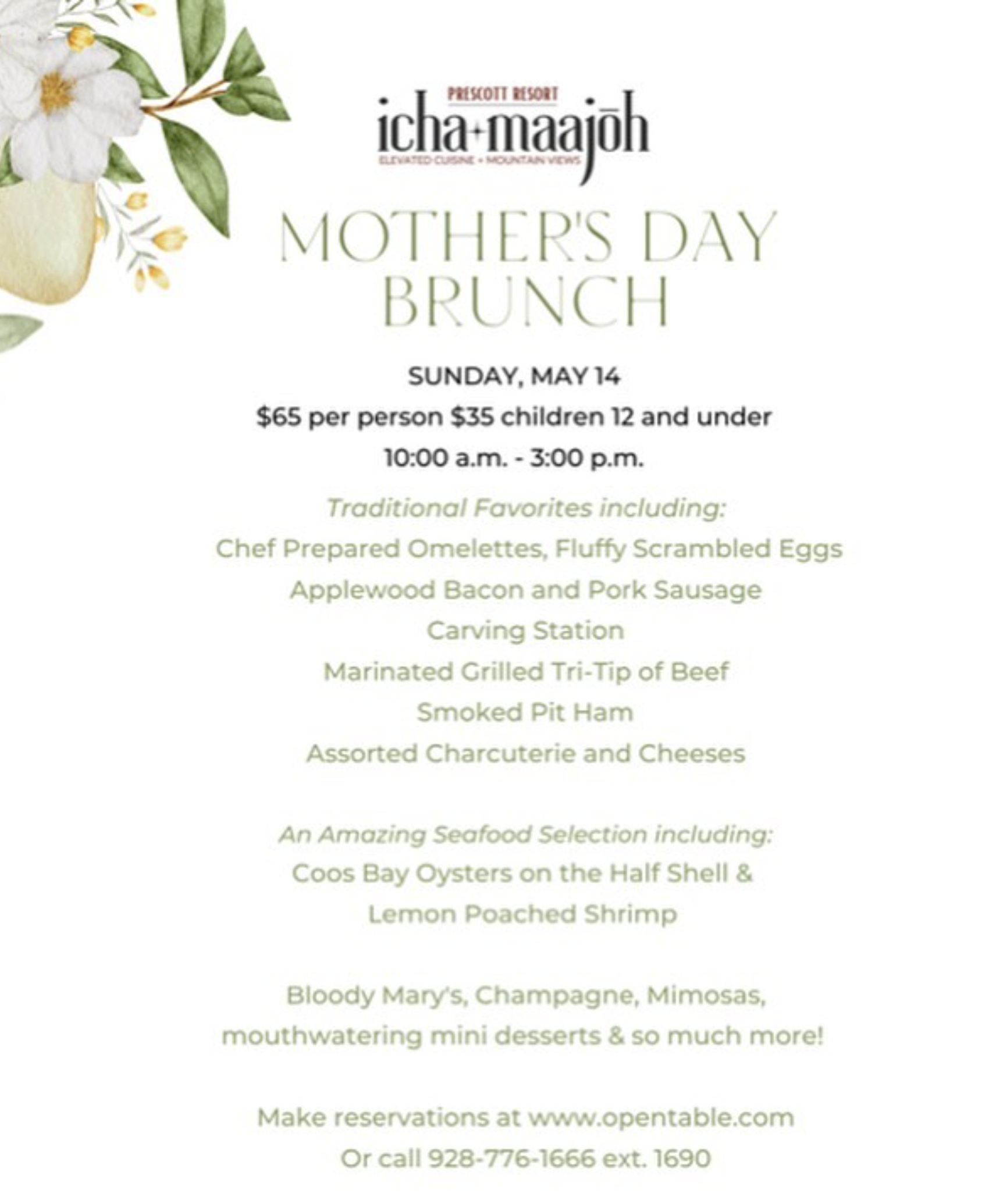 A Toast to Mom – Mother’s Day Brunch Sunday, May 14, 2023 | 10 am – 2 pm | Reservations Required | Call 928-237-4834 to reserve your space.
