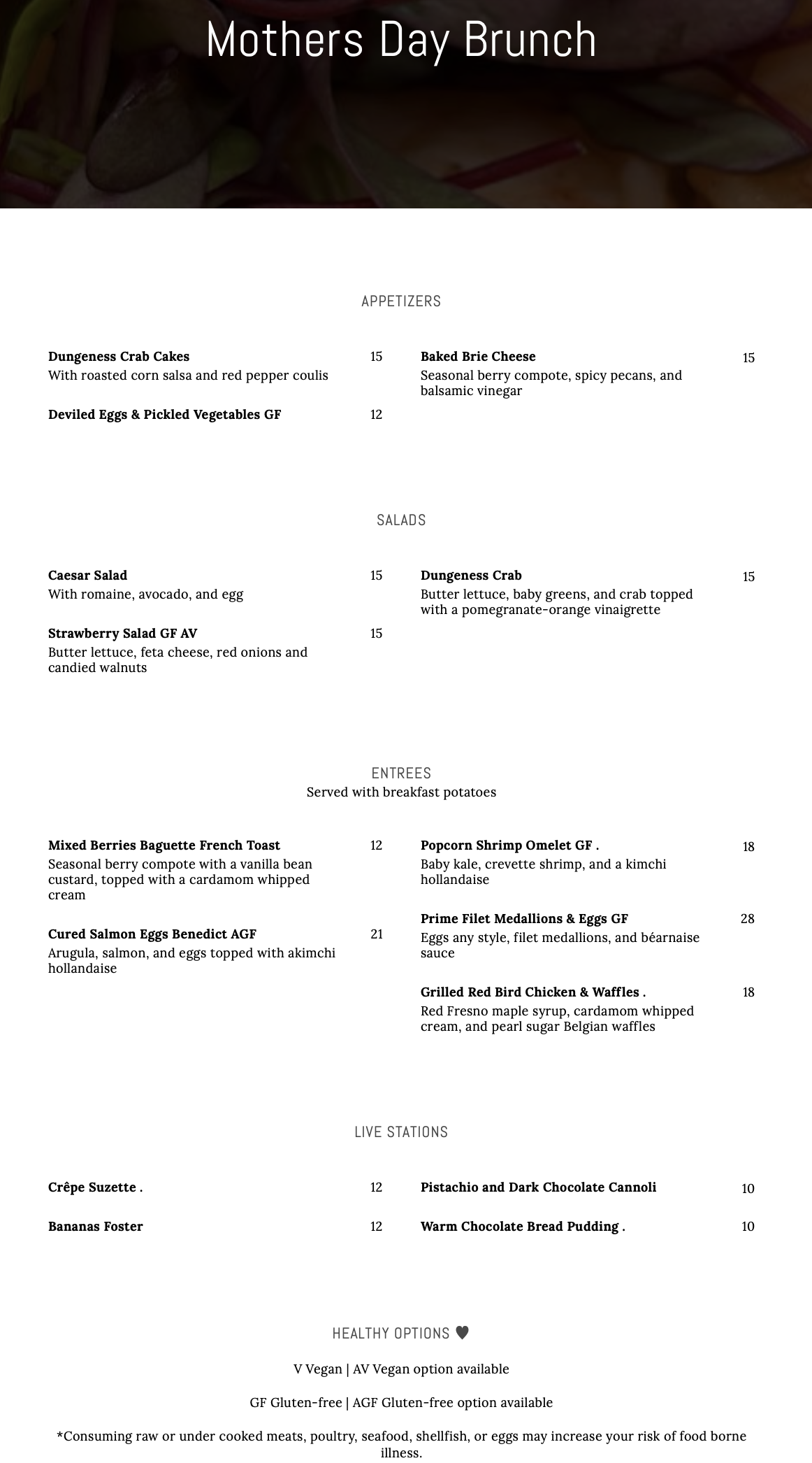 Mother’s Day Brunch menu will run 10am – 3pm and our regular lunch & dinner menu will begin at 4pm.