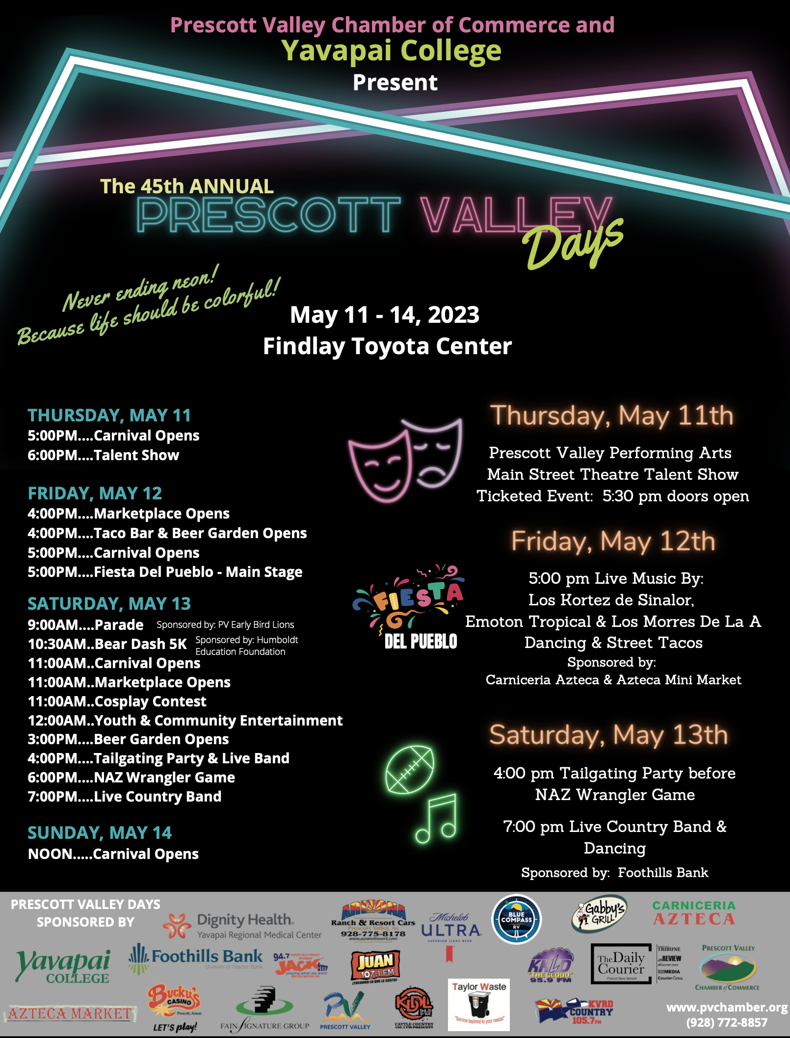 Prescott Valley Days will be held May 11-14, 2023 at the Findlay Toyota Center. Included in the weekend-long events are the Main Street Theatre Talent Show, Fiesta del Pueblo, Carnival, Parade, Cosplay Contest, Live music, dancing, a Wrangler’s football game, food trucks, vendors, and more!