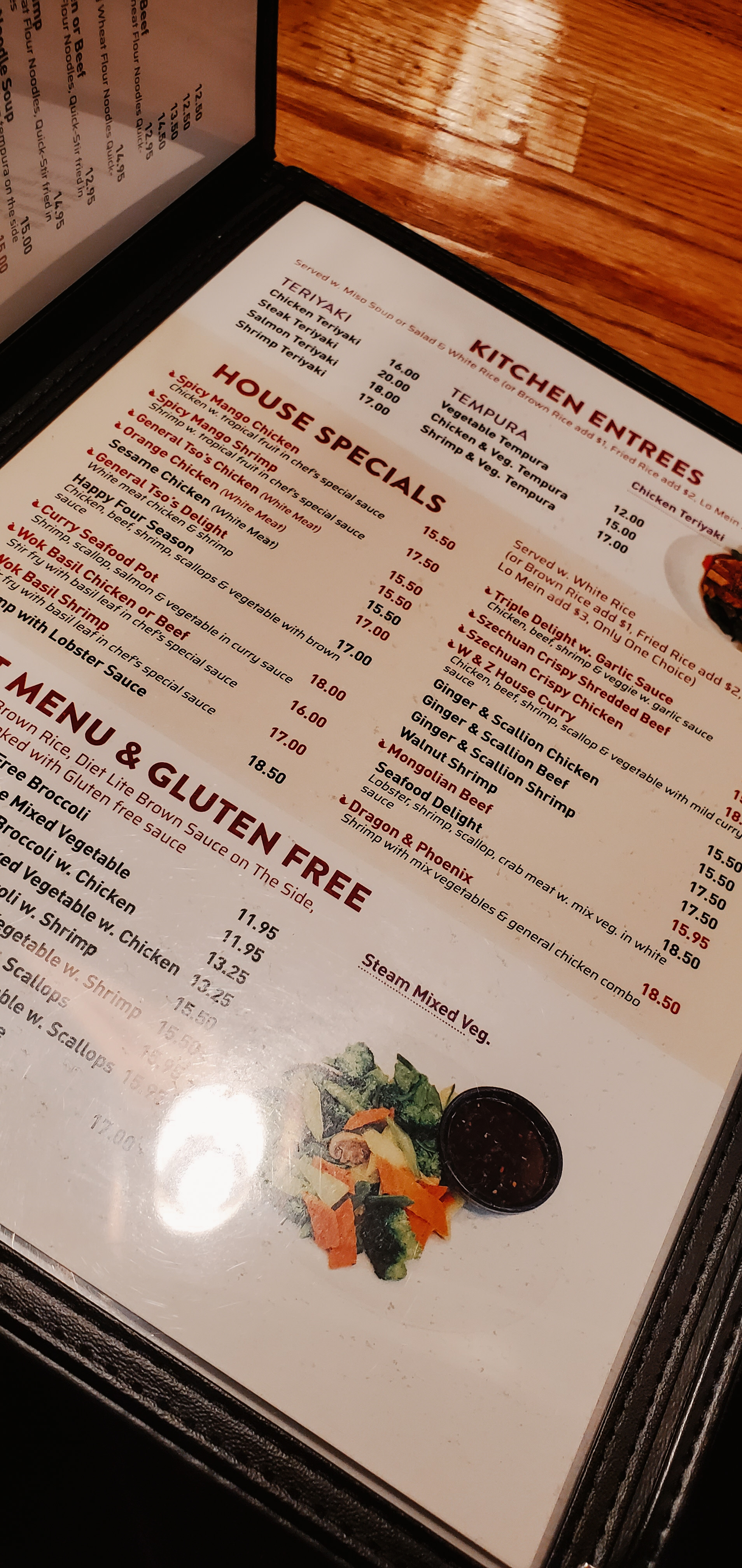 With a huge menu and a couple creative dishes, it’s easy to be satisfied with WZ’s selection as a catch-all “Asian” bistro. Some of the wait staff speak a southern dialect of Chinese and the flavors in the food also reflect southern, coastal, and island-Chinese tastes—that is, a little sweet, and not spicy …almost at all. For the heat-sensitive diner, the dishes we tried would not be off limits here, even the one that was listed with a spicy pepper icon next to it; don’t tell Sichuan province.