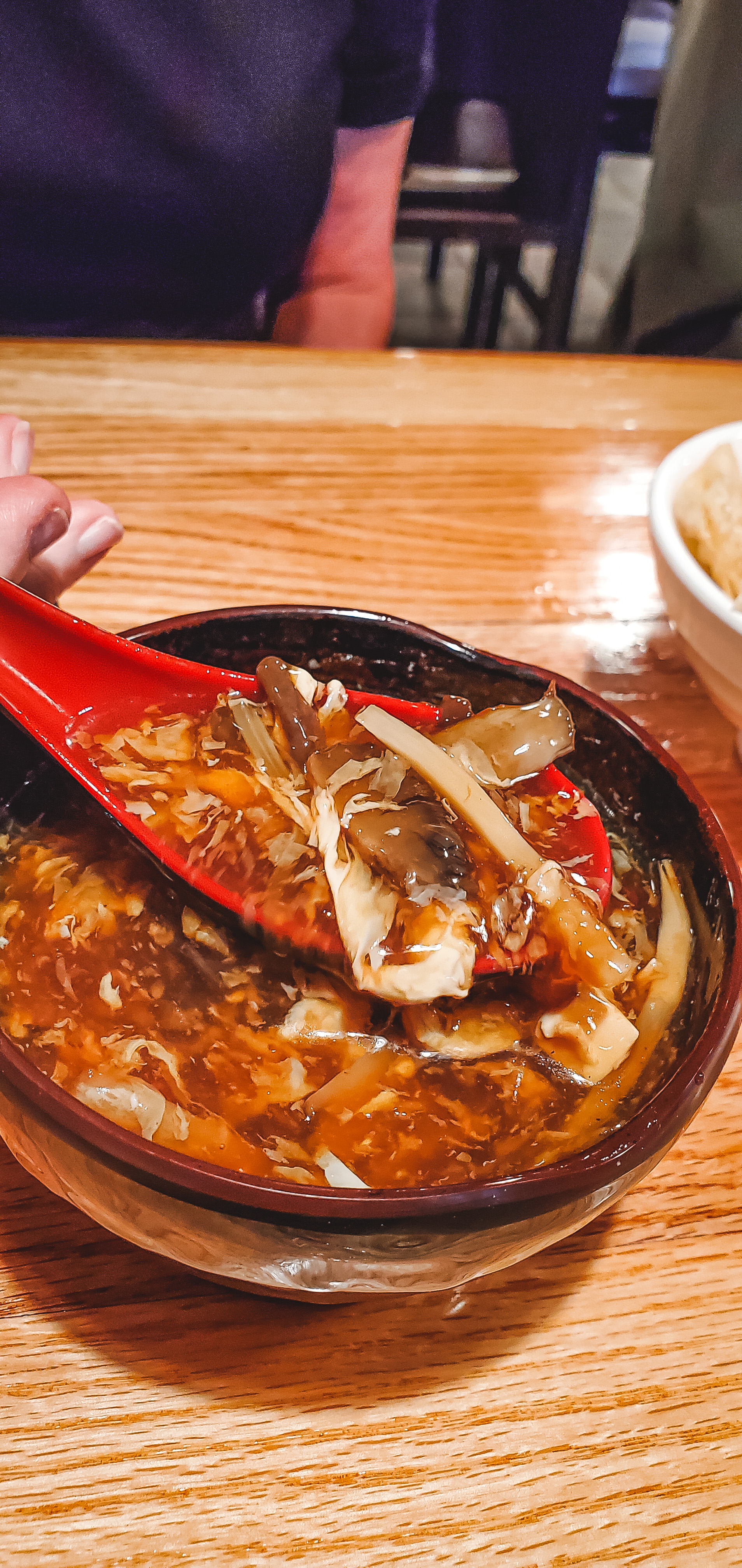 Although the hot and sour soup was disappointingly neither hot nor sour, it was anyway so sumptuously full of multiple kinds of freshly cooked mushrooms that I would rather call it an Asian mushroom stew and order it over and over again. If you want it either hot or sour, you’ll need to order it to-go and add some white vinegar and white pepper to get that classic hot-and-sour flavor. If you’re feeling like a forest forager who needs hearty mushroom infusions, then get you some of this.