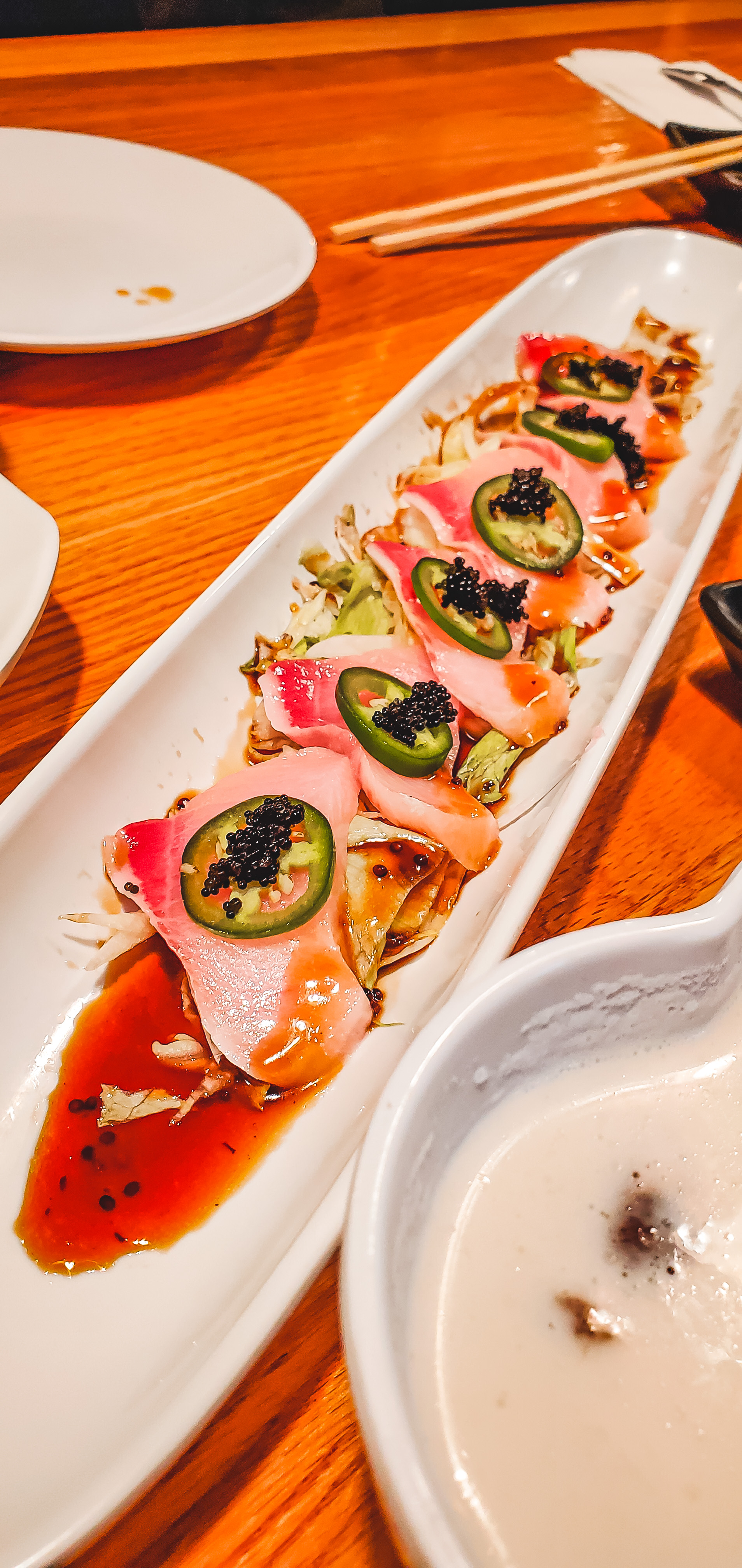 Their unexpected appetizer of yellowtail, jalapeño, yuzu-soy, and black tobiko (a more familiar looking caviar than orange tobiko, but not terribly common to find out here) was a creative offering amidst the standard gyoza and edamame list of appetizers. This lightly creative dish with its well-balanced flavors is something I would expect to find at a sushi bar perhaps in Montecito—a very pleasant surprise here. I would order it again.