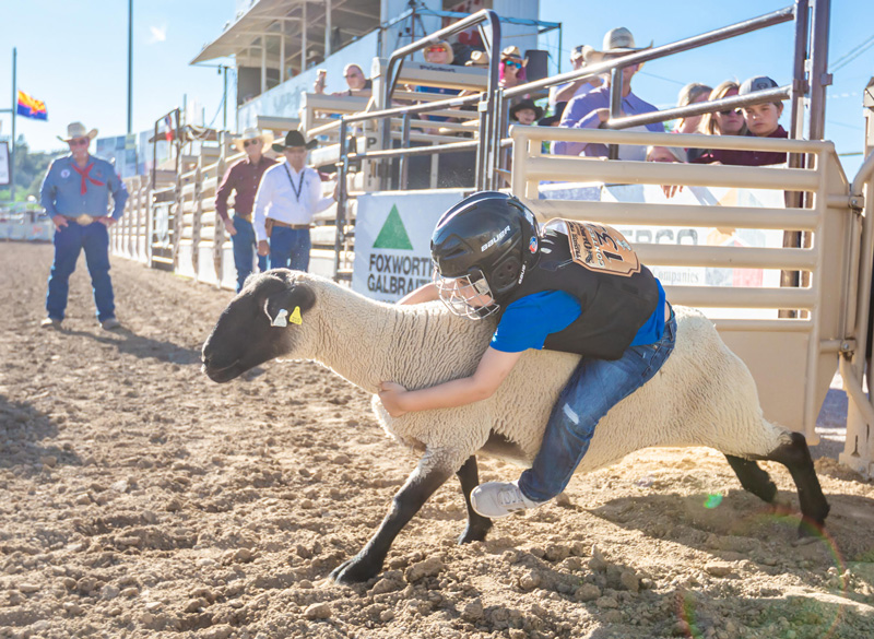 WORLD’S OLDEST RODEO’S PRE-SHOW -Rodeo’s youngest cowboys and cowgirls cinch up their jeans and climb aboard an atypical rough stock animal – sheep, also known as mutton.